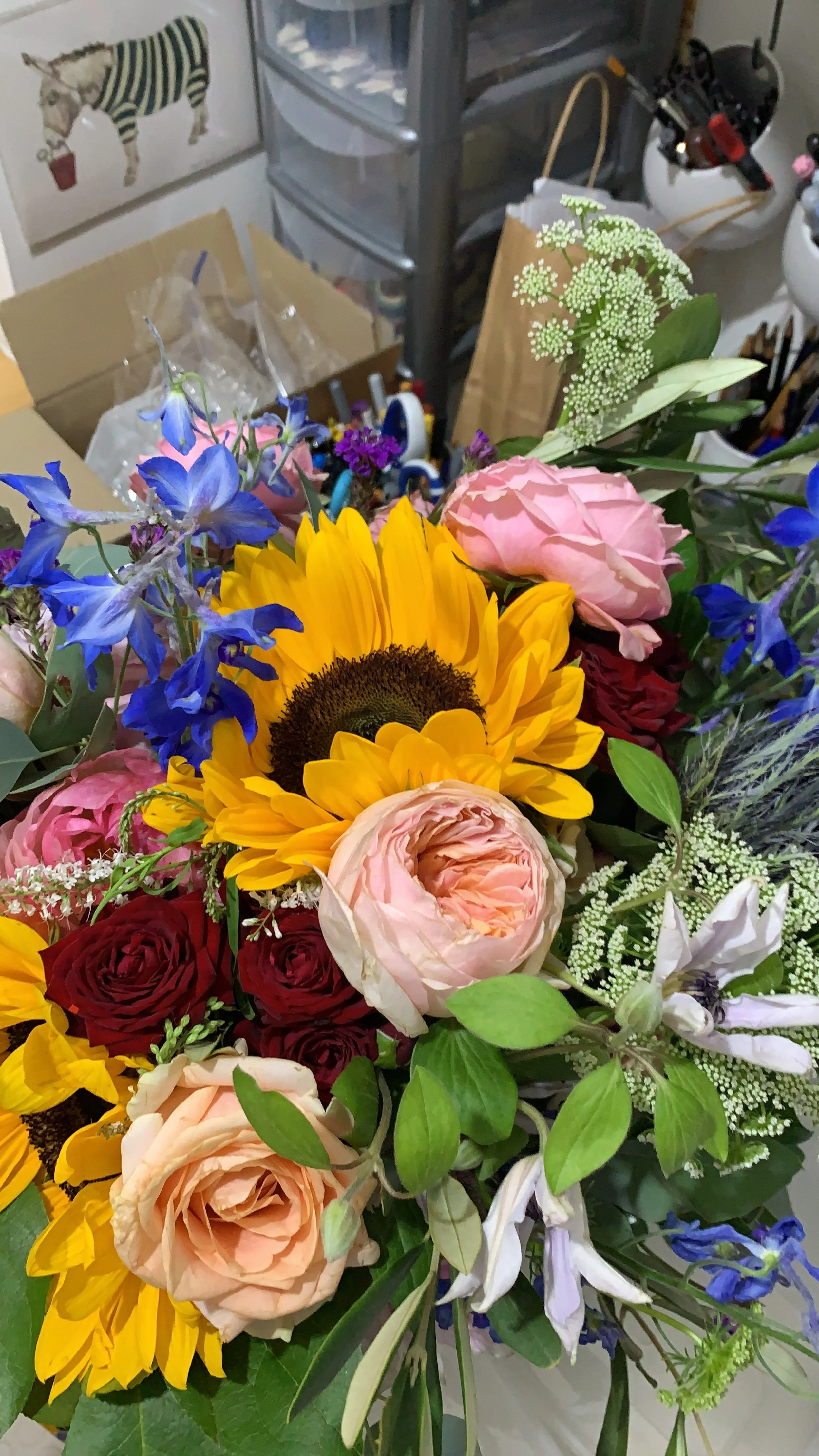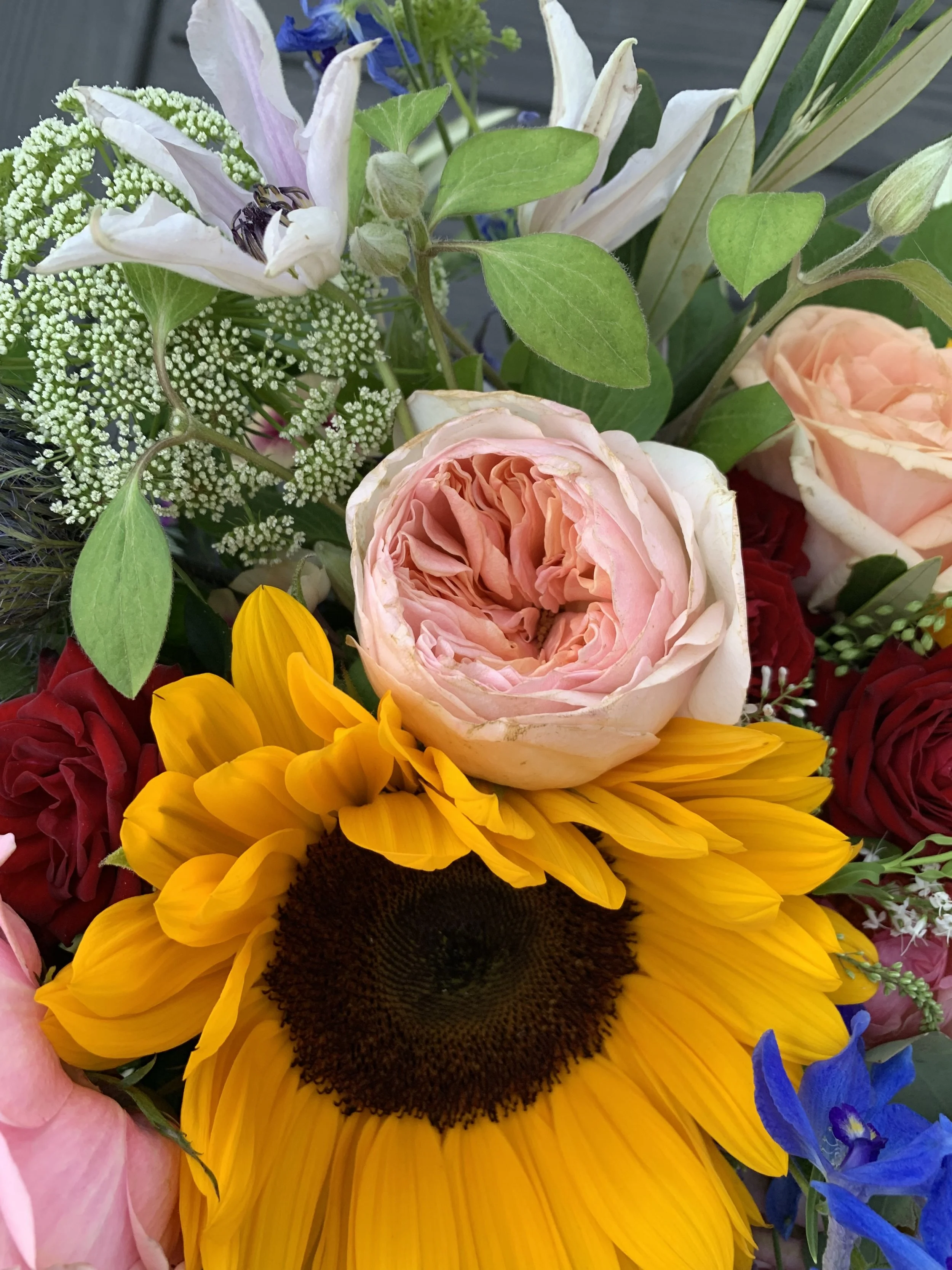 Included in the Wedding bouquet were red, pink and peach Roses, yellow Sunflowers, Clematis, pink Peonies and Dahlias, bright blue Delphiniums, Thistles, Ivy, Daucus, and Eucalyptus just to name a few.