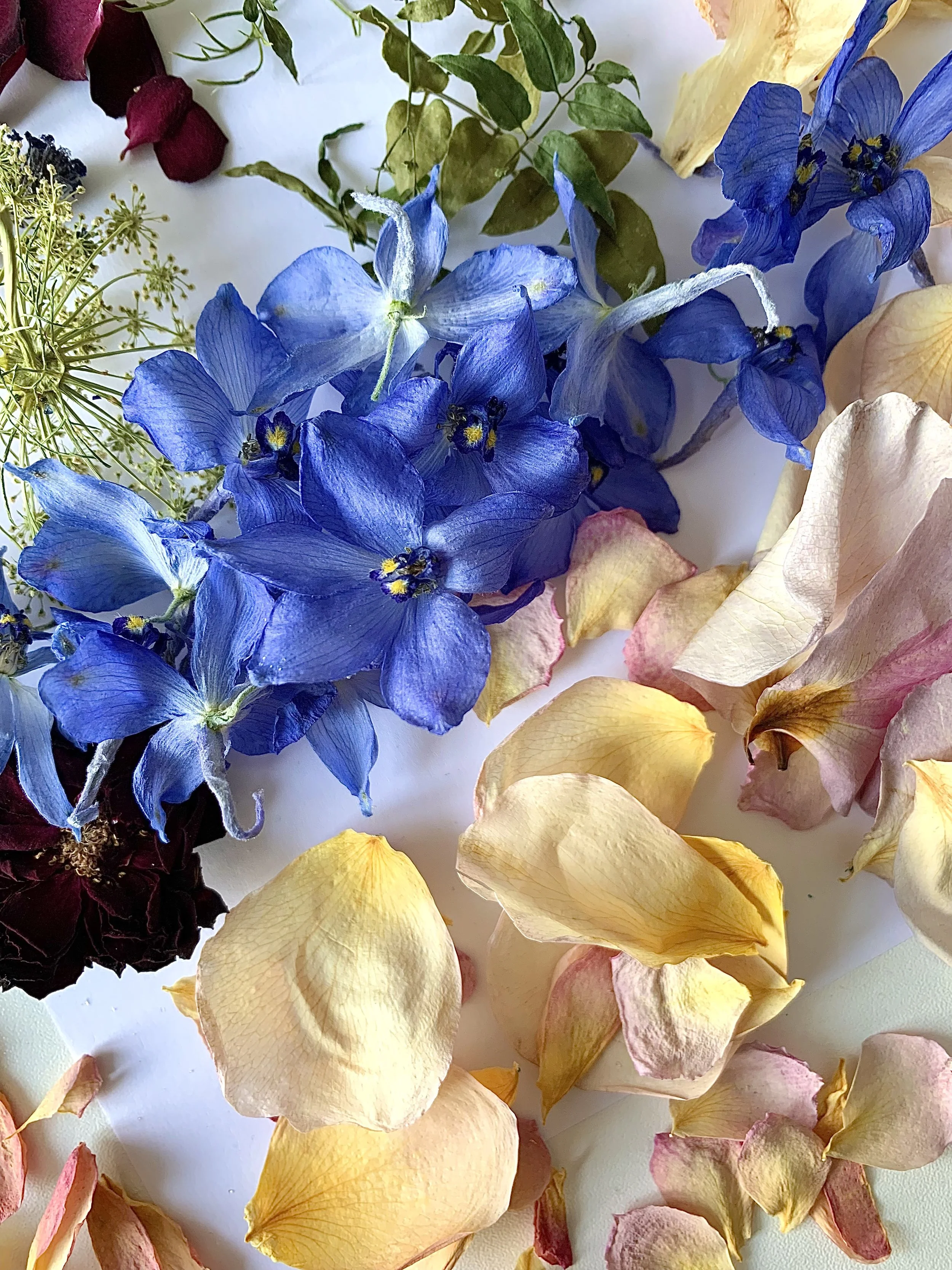 These petals and flowers have just been dried and you can see how beautifully they have kept their colours. As Rebecca and Marc bought them to me shortly after the wedding, I was able to dry them whilst they were at their best.