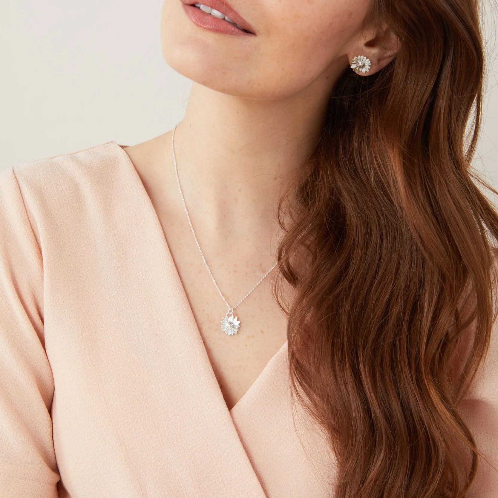 A handcrafted sterling silver daisy pendant on a silver chain a perfect botanical gift for her or a special friend.