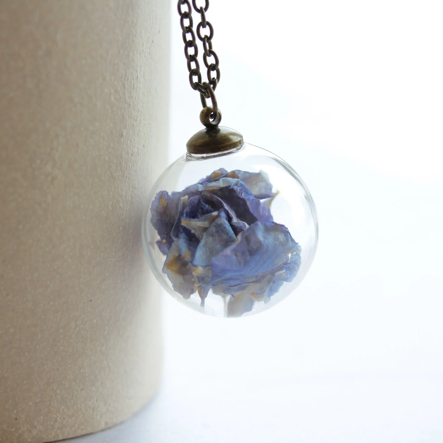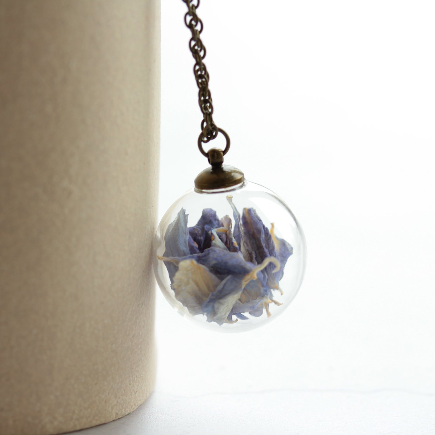 Delphiniums are loved for their tall, airy flower spikes and those clear blue tones that feel calm and uplifting. These petals are light and delicate, and I leave space inside the globe so they can gently move as you wear it. It keeps the look natural, and you get to enjoy the tiny shifts of shape and light.
